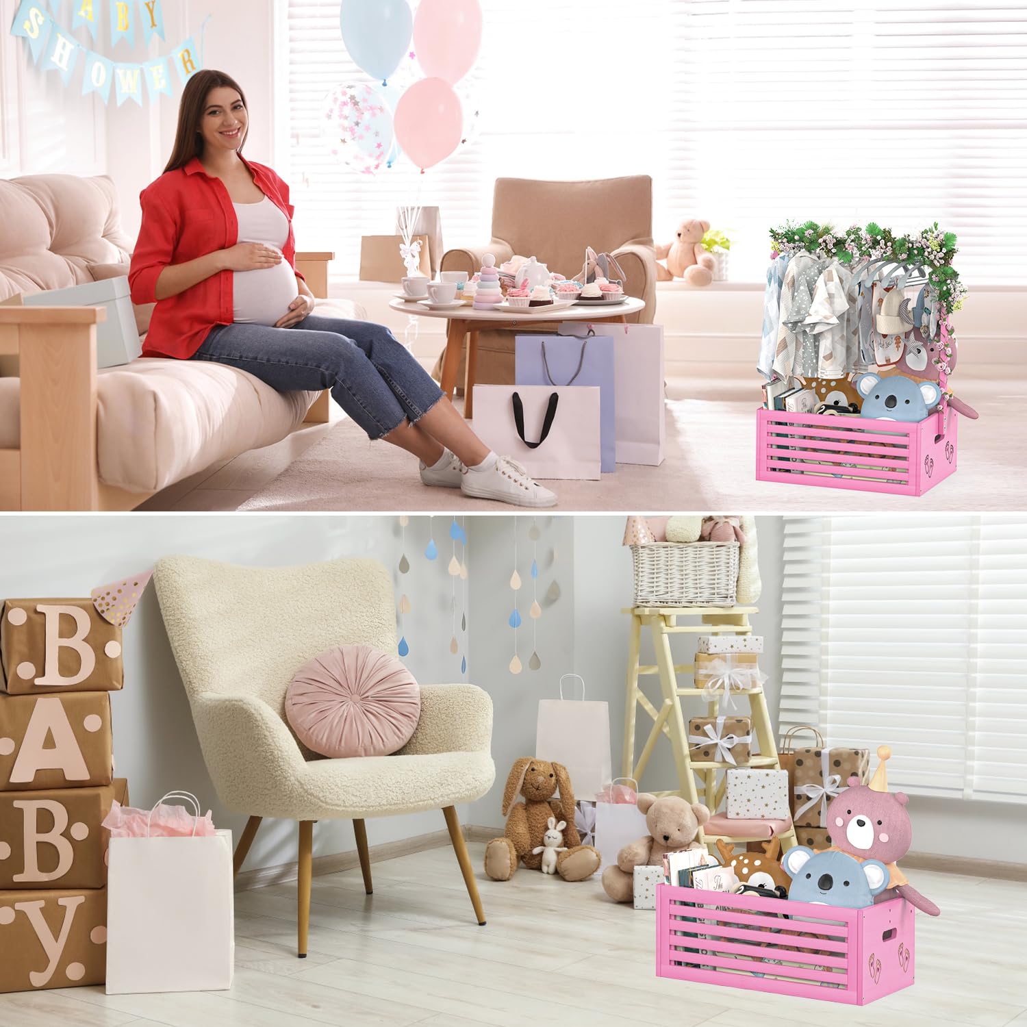 - Dual Function: This shower party basket with handle offers dual functionality of storage and hanging. Compared to other gift containers that only provide storage, our baby shower crate box comes with a spacious crate and hanging rack, enriching the display form, making it a practical and stylish choice